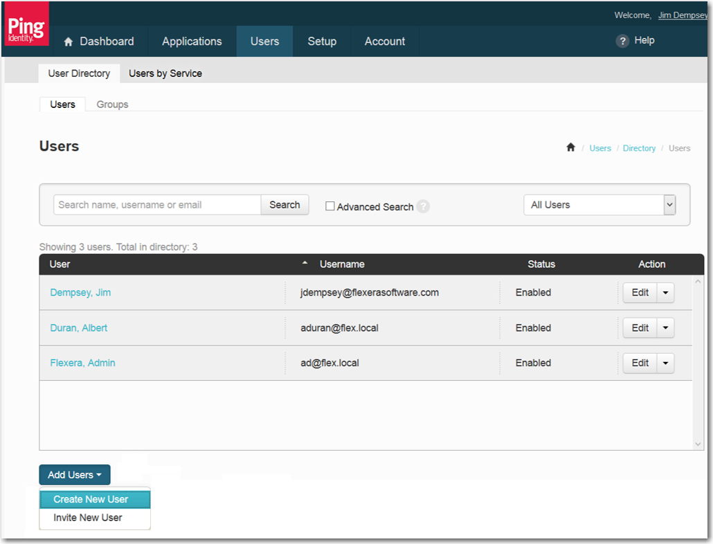 Log into Ping Identity as an admin and open the User Directory > Users tab on the Users menu. The Users view opens.