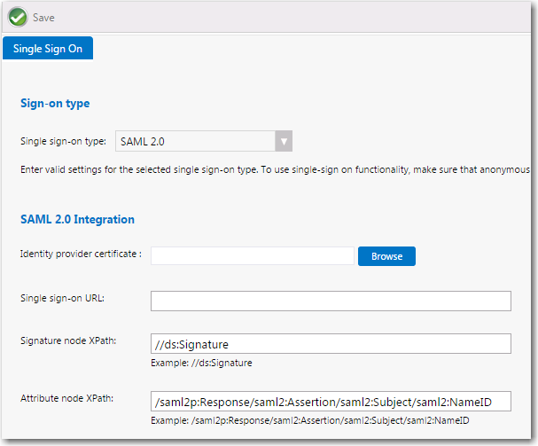 Under Standard User Interface and/or Mobile User Interface, select SAML 2.0 from the Single sign-on type list.