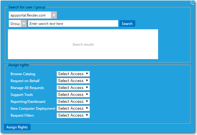noteTo assign rights to Microsoft Entra ID users and groups, Make sure that Microsoft Entra ID is configured successfully. Once the configuration is complete, the tenant name will be visible in the drop down, enabling you to proceed with assigning rights.